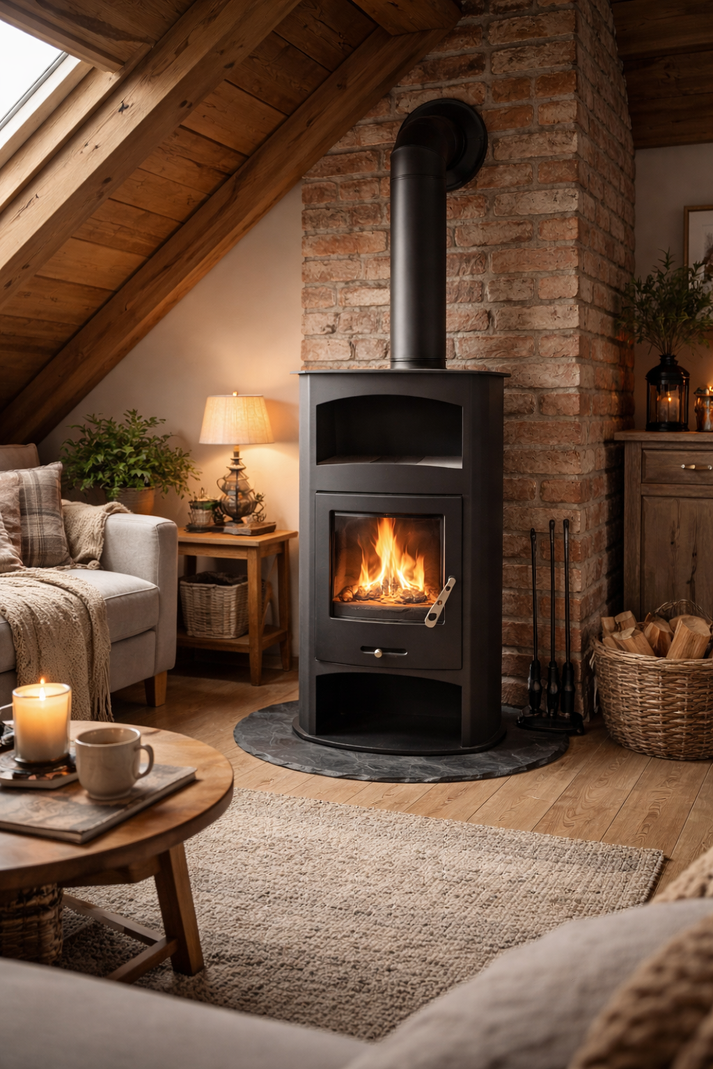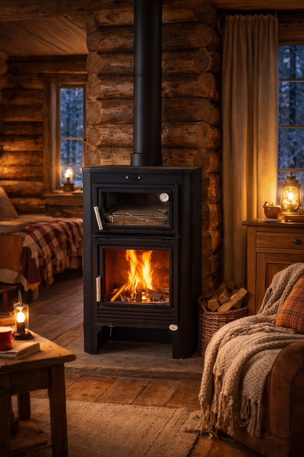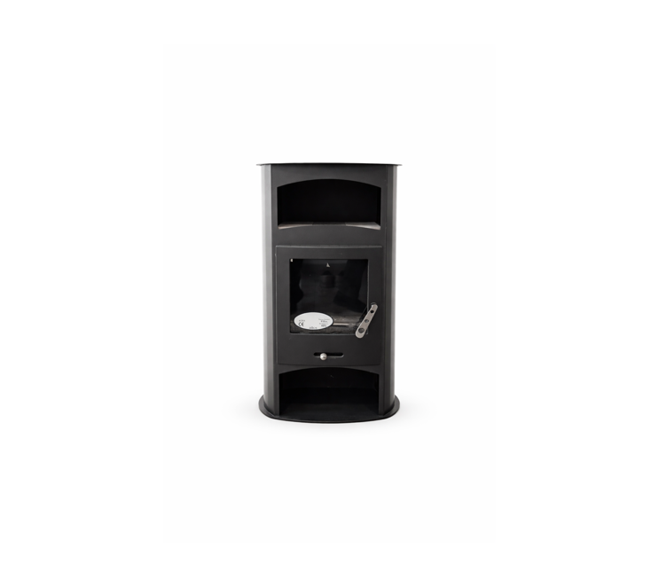 estufa de leña M-104 negra con horno superior y puerta de cristal