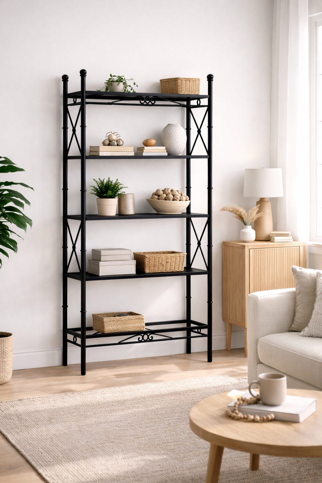 Cabecero de cama combinado en forja negra y madera con decoración tallada estilo arabesco.