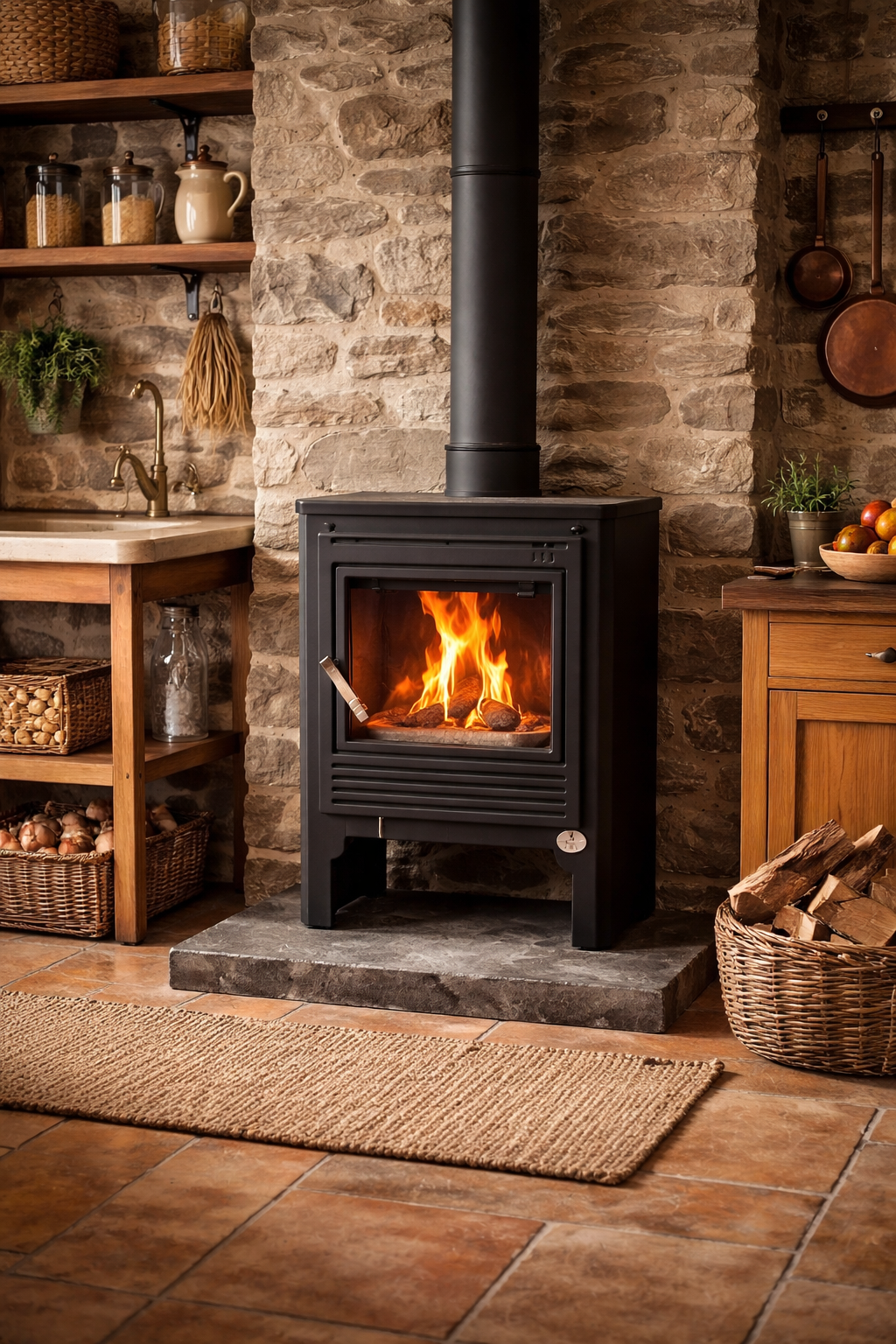 estufa de leña M-101 negra con puerta de cristal para calefacción del hogar