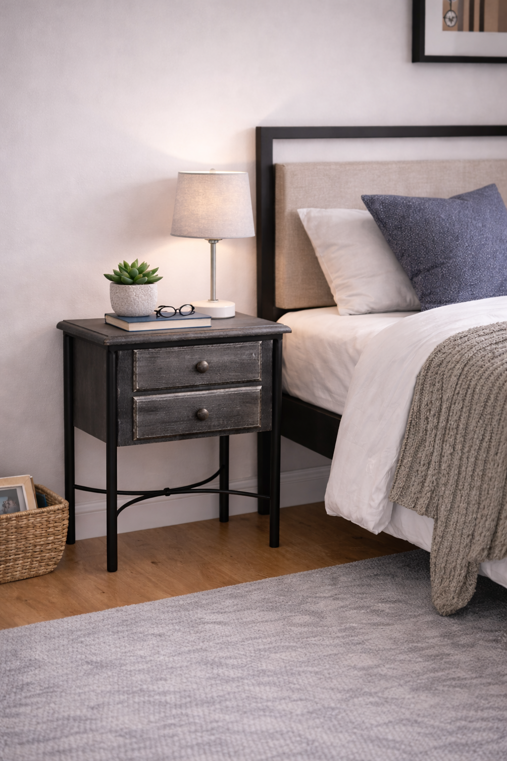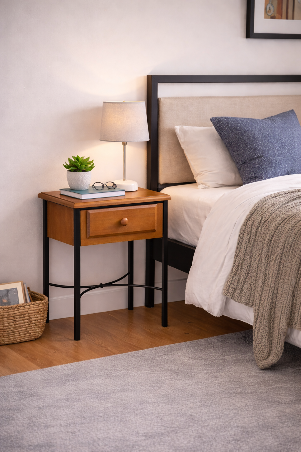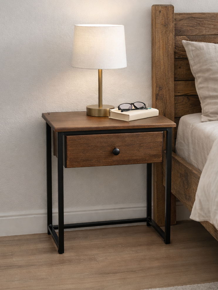 Mesita de noche de madera con cajón y estructura metálica estilo industrial