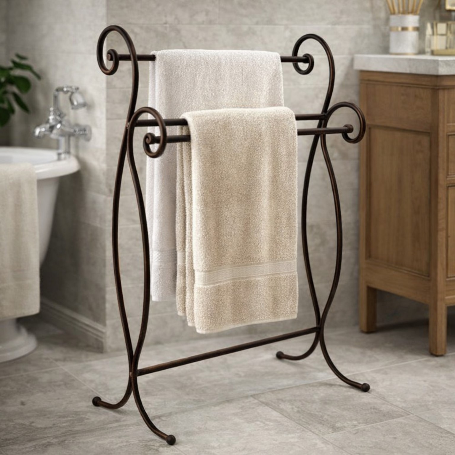 abecero de cama combinado en forja negra y madera con decoración tallada estilo arabesco.