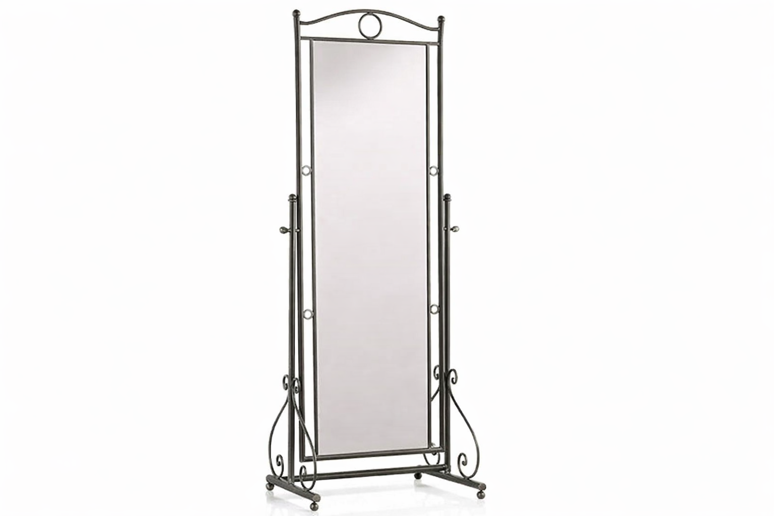 Espejo de forja metálico de pie, fabricado artesanalmente. En esta sección, existe la posibilidad de realizarlas en medidas y acabados, según las necesidades del cliente.